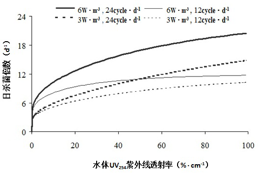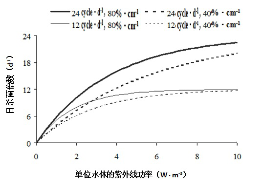 (1)在一個(gè)循環(huán)系統(tǒng)中,紫外線輸入功率循環(huán)水流和水的UV254的透率是影響紫外線殺菌效果的3個(gè)重要因素。單位水體的紫外線功率越大,殺菌效果越好;水體通過紫外燈殺菌器的速越大,總殺菌效果加大;UV254越大,殺菌效果越好;